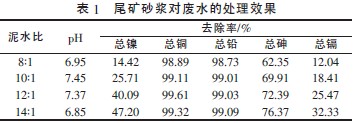 為考察尾礦砂漿對廢水的處理效果,在不添加任何水處理藥劑的條件下,僅將尾礦砂漿與廢水按照泥水比(質量比,下同)8∶1、10∶1、12∶1、14∶1 的比例混合。尾礦砂漿對廢水的處理效果如表1 所示。