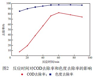 2.2 反應時間對COD去除率和色度去除率的影響