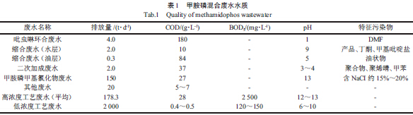 某公司所排放的甲胺磷廢水主要由甲胺磷等各種農(nóng)藥制劑生產(chǎn)過程中產(chǎn)生的廢水,如甲基氯化物、二甲胺、吡蟲啉等成分混合而成,pH 約為9~10,COD 范圍在20~30 g/L,鹽度大于15%, B/C比小于0.1,可生化性差,其中,高濃度甲胺磷有機廢水總量約178.3 m3/d,低濃度甲胺磷生產(chǎn)廢水總量約2 000 m3/d。