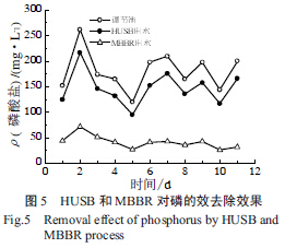 從圖4 和圖5 中可以看出,HUSB 對氨氮和磷具有一定的去除效果,平均去除率分別為18.9%和18.6%。而MBBR 對氨氮和磷去除效果,則平均分別為77.5%和72.1%。具體參見http://www.bnynw.com更多相關(guān)技術(shù)文檔。