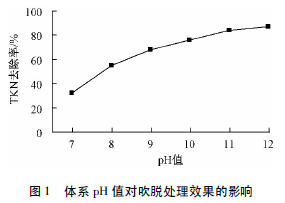可知,隨著溶液pH 值的增大,化學(xué)平衡不斷向右移動,會有較多的游離氨生成,當(dāng)pH 值> 11 時,水中的氨氮幾乎全部以游離氨的形式存在。因此,繼續(xù)增大pH 值,游離氨的含量增加不明顯,TKN 去除率也隨之增加緩慢。當(dāng)pH 值為11 時,吹脫出水pH 值約為10,只需投加少量酸或者通過回流少量生化反應(yīng)池出水與之混合即可將吹脫出水pH 值調(diào)節(jié)到偏堿性。因此,考慮到運行成本等因素,最佳pH 值確定為11。
