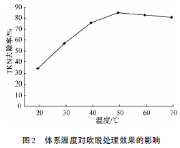 由圖2 可知: 隨著廢水體系溫度增高,TKN 去除率不斷增大,50℃時已超過80%。這是因為,反應(yīng)式