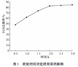 由圖3 可知: 隨著廢水體系吹脫時間的延長,吹脫前后TKN 去除率呈現(xiàn)不斷上升最后趨于穩(wěn)定的趨勢,說明2 h 后氨氣在氣、液兩相達(dá)到平衡,考慮到工程運行,吹脫最佳時間確定為2 h。