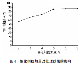 由圖4 可知: 隨著催化劑投加量的增大,對脂肪胺催化吹脫速率迅速增大,脂肪胺轉(zhuǎn)化為低分子氨速率也隨著增大,TKN 去除率迅速增大,當(dāng)催化劑投加量超過5%時去除效果趨于穩(wěn)定,因此催化劑的最佳投加量確定為5%。