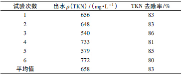 吹脫最佳工藝條件為: 溫度為50 ℃,時間為2 h、pH 值為11,ClO2為投加量為10 mg/L,氣水體積比為3 000∶1,催化劑投加量為5%,在該條件下對原水ρ(TKN) = 3 860 mg/L 脂肪胺廢水進(jìn)行平行試驗,試驗結(jié)果如表1 所示。