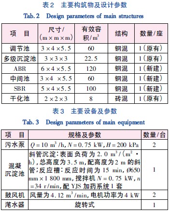 廢水流經格柵、多級沉淀池后截留原料中的碎米和顆粒較大的米粉,沉淀池的沉淀物定期打撈全部回收,經晾曬后作畜牧飼料。再投加PAC 進行混凝沉淀,出水溢流到ABR,在此將大分子的有機物轉化成小分子的有機物,進一步提高了廢水的可生化性,同時降解大部分COD,然后出水進入中間池,由潛水泵提升至SBR 反應池,進行好氧生物處理。主要構筑物和設備分別見表2、3。