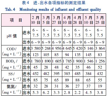 該工程完成土建及設備安裝工程后開始通水調試,經過5 個月的運行(水量為100 ~150 m3 /d) ,通過了環保部門的驗收,出水水質監測結果見表4。各項指標均達到《污水綜合排放標準》(GB 8978—1996) 的二級標準。