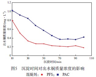 由圖5可見,使用不同的混凝復配劑處理時,出水銅質量濃度均呈現先快速下降、后趨于穩定的趨勢。這主要是由于:PFS作為絮凝劑時,形成的礬花大、密實、沉淀快,而PAC的混凝效果較差;另一方面攪拌初期復配劑對銅的去除作用主要在硅藻土的外表面和部分微孔內進行,在短時間內就可以完成;隨著銅去除率的增加,金屬離子產生的斥力增強,游離金屬離子進一步深入微孔內部的阻力增大,因此去除率變化很小。從現象上看,在沉淀時間為0~40 min時, PFS-硅藻土復配劑處理后的絮體沉淀速率很快,在40 min后,上清液中銅質量濃度基本趨于穩定,出水銅質量濃度在0.30 mg/L左右;而PAC-硅藻土復配劑處理后絮體沉淀速率相對較慢,上清液中銅質量濃度在70 min后基本趨于穩定,出水銅質量濃度在0.40 mg/L左右。