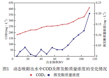 在20 ℃條件下,將預處理后的廢水以4.0 BV/h(BV為流出液體積相當于樹脂柱體積的倍數)流量通過裝有50 mL(濕體積)HZ-16型大孔樹脂的吸附柱,測定吸附出水中COD及揮發酚質量濃度,繪制樹脂的動態吸附曲線。