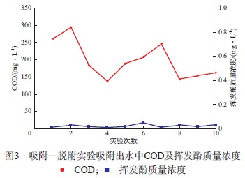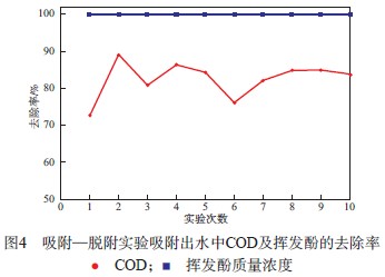 由圖3和圖4可見:10次動態吸附—脫附實驗,吸附出水中COD為137~294 mg/L,COD去除率為72.5%~89.1%;吸附出水中揮發酚質量濃度穩定在0.05 mg/L以下,揮發酚去除率為99.8%~100%。