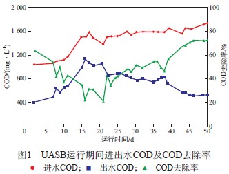 廢水進(jìn)入UASB 運(yùn)行1 d后即有產(chǎn)氣現(xiàn)象,隨著廢水進(jìn)水量的逐漸增加,運(yùn)行7 d左右UASB內(nèi)污泥顏色發(fā)生明顯改變,由灰白色變?yōu)橥咙S色,污泥床層內(nèi)產(chǎn)生較多氣泡,說明厭氧顆粒污泥較容易馴化為反硝化污泥。UASB運(yùn)行期間進(jìn)出水COD及COD去除率見圖1。由圖1可見:UASB啟動初期(1~16 d),進(jìn)水COD由1 045 mg/L逐漸升高至1 510mg/L,出水COD由410 mg/L逐漸升高至1 145 mg/L,COD去除率逐漸下降,由60.8%降至24.2%,這是因為啟動初期UASB運(yùn)行不穩(wěn)定,隨著進(jìn)水COD的升高,有機(jī)物的降解效果變差,COD去除率逐漸降低;UASB運(yùn)行16~50 d,進(jìn)水COD繼續(xù)逐漸升高,COD去除率也逐漸提高,運(yùn)行50 d時進(jìn)水COD升高至1 730 mg/L,出水COD約530 mg/L,COD去除率為69.4%,表明UASB運(yùn)行穩(wěn)定性逐漸提高,對污染物去除效果較好。