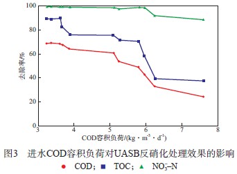 進(jìn)水COD容積負(fù)荷對UASB反硝化處理效果的影響見圖3。由圖3可見:隨著進(jìn)水COD容積負(fù)荷的增加,UASB中COD去除率、TOC去除率和NO3--N去除率均逐漸下降;進(jìn)水COD容積負(fù)荷不超過6 kg/(m3·d)時,COD去除率為42.7%~69.4%,TOC去除率為58.0%~90.0%,NO3--N去除率接近100%。