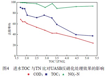 UASB運(yùn)行穩(wěn)定階段,進(jìn)水TOC 與TN 比對UASB反硝化處理效果的影響見圖4。