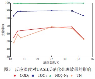 反應(yīng)溫度對UASB反硝化處理效果的影響見圖5。由圖5可見,反應(yīng)溫度為18~34 ℃時,COD去除率、TOC去除率、NO3--N去除率及TN去除率均變化不大,說明反應(yīng)溫度在一定范圍內(nèi)波動對UASB反硝化處理效果影響不大。