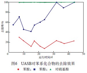 UASB對苯系化合物的去除效果見圖6。由圖6可見:UASB對苯胺的去除率最低,平均去除率為19.0%;隨著UASB的運(yùn)行,UASB對苯酚的去除率逐漸升高,最高可達(dá)100%;UASB對對硝基酚的去除效果最好,對硝基酚去除率一直接近100%;可見UASB對苯系化合物的去除率從高至低順序為對硝基酚>苯酚>苯胺。