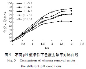 由圖5 可知,催化劑投加量為1. 5 g /L,廢水pH 值為6. 5,隨著光照時間的延長,廢水色度去除率逐漸升高,但當反應超過2. 5 h 后,色度的去除率升幅很緩慢。可見,光照時間過長,并不能提高廢水色度的去除效率。反應時間過短,廢水中的有機物質還沒有得到進一步的氧化降解; 而當光照時間過長,催化劑容易失活; 此外由于有機物的吸附也會包裹住催化劑,這些都會影響催化效果。