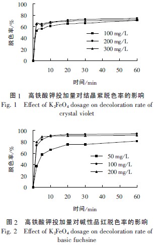 分別以50 mg/L 的結(jié)晶紫和堿性品紅廢水為反應(yīng)溶液,在20 ℃恒溫下,考察高鐵酸鉀投加量對(duì)結(jié)晶紫和堿性品紅脫色率的影響,試驗(yàn)結(jié)果見(jiàn)圖1和圖2。