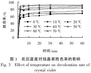 分別以50 mg/L 的結(jié)晶紫和堿性品紅廢水為反應(yīng)溶液,高鐵酸鉀投加量分別為200 和100 mg/L,考察反應(yīng)溫度對(duì)脫色率的影響,試驗(yàn)結(jié)果見(jiàn)圖3 和圖4。