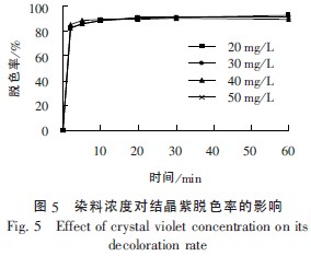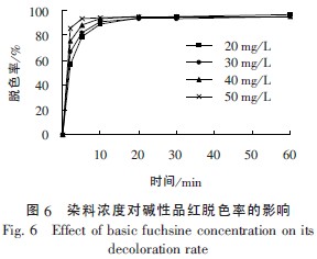 根據(jù)高鐵酸鉀降解50 mg/L 結(jié)晶紫的最佳投加量(200 mg/L)可確定高鐵酸鉀與結(jié)晶紫的質(zhì)量比為4∶ 1,恒溫60 ℃,考察結(jié)晶紫質(zhì)量濃度(20 ~ 50mg/L)變化對(duì)脫色率的影響,試驗(yàn)結(jié)果見(jiàn)圖5。通過(guò)高鐵酸鉀降解50 mg/L 堿性品紅的最佳投加量(100 mg/L)可確定高鐵酸鉀與堿性品紅的質(zhì)量比為2∶ 1,恒溫30 ℃,考察堿性品紅質(zhì)量濃度(20 ~ 50mg/L)變化對(duì)脫色率的影響,試驗(yàn)結(jié)果見(jiàn)圖6。