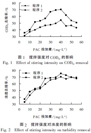設定混凝劑PAC 的投加量為5~55mg/ L,沉淀時間為20min,研究攪拌強度對混凝效果的影響,試驗結果見圖1、圖2。