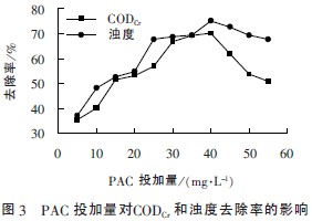 由圖3 可知,當PAC 的投加量為5~40mg/ L時,CODCr和濁度的去除率均隨投加量的增加而明顯上升。投加量為40mg/ L 時,混凝效果最好,CODCr和濁度的去除率分別為70%和75%。故PAC 的最佳投加量為40mg/ L。