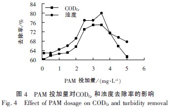 由圖4 可知,當PAM 的投加量為0.1~3.5mg/L 時,CODCr和濁度的去除率明顯上升。當PAM 的投加量為3.5mg/ L 時,混凝處理效果最佳,CODCr和濁度的去除率最高可分別達到75%和80%。