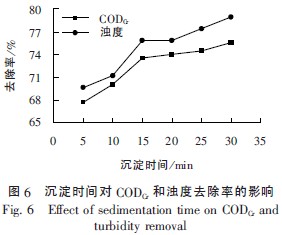 由圖6 可知,CODCr和濁度的去除率均隨著沉淀時間的延長而上升,上清液也越來越清澈,但達到一定沉淀時間后,去除率的上升就不明顯了。沉淀時間在5~15min 內,CODCr和濁度的去除率上升較快,15min 后CODCr和濁度的去除率雖然也有所上升,但變化幅度不到4%。因此最佳沉淀時間為15min。