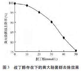 實驗中pH 發生變化且檢測到O3的存在,這與Wilk L.J.等和Shiue L.R.所得結論相一致。為了證明·OH 的存在于電消毒體系中,現加入叔丁醇來說明,叔丁醇與·OH 反應速率很大,常用于·OH 的定性分析。實驗結果如圖3 所示,糞大腸菌群去除率隨著叔丁醇濃度的提高而不斷地降低,幅度可達25%。這是由于叔丁醇與·OH 反應常數很大,與糞大腸菌群競爭反應時,·OH 易于被叔丁醇捕獲,從而使糞大腸菌群反應機率減少,去除率就會下降,所以說·OH 存在于電化學消毒體系中。污水中含有300 mg/L Cl -,在消毒過程中監測到Cl -含量是下降的,有可能轉化為Cl2、ClO-和HClO 活性氯基團。這些大量的活性基團協同破壞致病微生物細胞結構,將其殺死。碳纖維殺菌主要依靠低壓的電場效應與高壓的電氧化還原作用。碳纖維具有豐富微孔隙結構,可吸附大量的細菌與病毒,當電場強度超過細胞膜電位時,會使細胞膜穿孔,以致細胞質通過微孔流失。在高電壓時,發生電化學氧化反應,生成具有強氧化性的基團,活性基團產生數量與電極本身性質有密切關系,碳纖維析氧過電位要比Ti/SnO2-Sb2O3/β-PbO2的低,生成活性氧基團有限。因此,碳纖維的殺菌效率沒有Ti/SnO2-Sb2O3/β-PbO2的高。