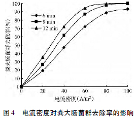 由圖4 可得,在消毒時間不變時,糞大腸菌群去除率隨著電流密度的增大而逐漸地提高。這是由于電流密度越大,電化學反應速率越快,陽極所產生的強氧化性活性物質數量越多,能夠將更多的致病細菌、病毒殺滅,提高殺菌效率; 但是從能耗方面考慮,并不是電流密度越大越好,還與消毒時間有關系。當消毒時間為6 min,電流密度為0 ~ 100 A/m2 時,出水中的糞大腸菌群數大于8 600 cfu/L。當消毒時間為9 min,電流密度為100 A/m2 時; 當消毒時間為12 min,電流密度為80 A/m2 時,出水中的糞大腸菌群數小于500 cfu/L。依據法拉第電解第一定律,在電極上發生化學變化的物質A 的量N 同通過電解液的總電量Q(即電流強度I 與通電時間t 的乘積)成正比,即NA=KQ=KIt,可得,實驗參數為t=12min、I=80 A/m2 所產生的活性物質數量多于實驗參數為t=9 min、I=100 A/m2 的。當電流密度過大時,陽極上會發生副反應或次級反應,使水體其他物質發生電解反應,降低電流效率。因此,在達到相同的糞大腸菌群去除率條件下,采用消毒時間為12min,電流密度為80 A/m2 的工藝參數最為適宜。