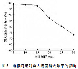 在恒電流密度為80 A/m2,消毒時間為12 min,其他實驗條件不變的條件下,研究不同電極間距對消毒過程的影響,結果如圖5 所示。