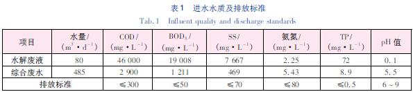該公司產生的廢水分為水解廢液和綜合廢水,排放量分別為80m3/d 和485m3/d。水解廢液COD 濃度很高,達到46 000 mg/L,硫酸鹽含量達54 000 mg/L,氫離子濃度達0.8 mol/L;綜合廢水包括淀粉洗滌水、水解物和纖維素等洗滌水以及生活污水。綜合廢水COD 濃度較低,平均值為2 900mg/L。出水水質執行《皂素工業水污染物排放標準》(GB 20425—2006)。