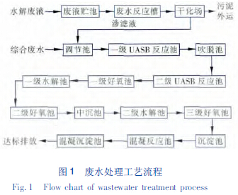 水解廢液流入廢液貯池,均化水質后進入廢水反應槽,用氧化鈣中和后進入干化場進行泥水分離,干污泥定期外運,滲濾液與綜合廢水進入綜合廢水處理系統再進行處理。調節池對混合廢水進行中和后進行兩級厭氧處理,即依次進入一級UASB 反應池、吹脫池和二級UASB 反應池,其中吹脫池通入大量空氣可將一級UASB 出水中溶解態的H2S 吹脫,降低廢水的毒性。UASB 出水再進入多級水解好氧段生物處理工藝,依次為一級好氧池、一級水解池、二級好氧池、中沉池、二級水解池、三級好氧池,有效降低廢水中高含鹽量對生物的抑制作用,最后進行混凝沉淀后達標排放。