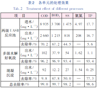 該廢水處理工程從2011 年11月開始調試,接種城市污水處理廠脫水污泥,同時輔以雞糞、豬糞調配補充均衡廢水中的營養成分,進行污泥培養。兩級UASB 反應池和多級水解好氧段的菌種馴化均采用間歇進水培養,并逐步過渡到連續進水。在UASB 反應池調試過程中,pH 值控制在6.5~7,以創造適于甲烷菌生長的環境。經過5 個多月的調試,兩級UASB 反應池的水封罐明顯產氣,二級UASB 反應池污泥中有甲烷菌存在;好氧污泥中有大量的鐘蟲,SVI 值基本處于50~120 mL/g,出水水質達到《皂素工業水污染物排放標準》(GB 20425—2006)。各單元的處理效果見表2。此處需要說明的是UASB 反應池出水氨氮為208 mg/L,遠高于進水氨氮濃度,原因可能是廢水中的有機氮在這一階段被厭氧微生物不斷降解,產生了大量的氨氮。