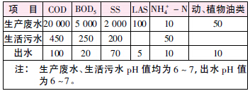 該廢水組分復雜,有機污染物濃度高,BOD5/COD 值<0.25,屬于難生化降解廢水,廢水中SS 濃度高且含有一定濃度的表面活性劑、動植物油類。