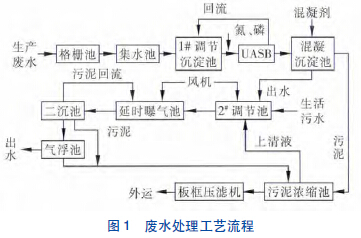 綜合考慮廢水水量、水質特點和處理成本,決定采用UASB/延時曝氣/氣浮聯合工藝,流程如圖1 所示。