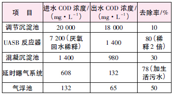 工程調試的重點在于UASB 厭氧反應系統的啟動,關鍵在于控制UASB 不發生酸化。UASB 啟動直接購買顆粒污泥進行接種,接種量為150m3。啟動初期采用間隙進水方式,進水量為150m3/d,利用出水回流稀釋進水COD 在4 000 ~ 5 000mg/L,通過蒸汽加熱保證進水溫度略高于37 ℃,投加NaOH 控制pH 值為7.2 ~ 7.5,能夠有效防止由于容積負荷的提高所引起的反應器酸化,投加氮源、磷源以及必需的微量元素以保證進水中C ∶ N ∶ P 為200 ∶ 5 ∶ 1。啟動階段UASB 出水VFA < 200mg/L,沒有出現積累現象,表明UASB 中產甲烷菌活性較好,生化處理效果良好。UASB 啟動時間短,一個月左右達到了設計容積負荷,進水COD 濃度經稀釋后為7 200mg/L,出水為1 400mg/L,去除率>80%。延時曝氣池接種污泥采用當地污水處理廠的好氧污泥,運行穩定后污泥濃度為4 000mg/L,控制污泥回流比為100%。延時曝氣池進水COD 濃度約為600mg/L,出水為132mg/L,去除率>78%。
