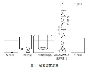 試驗(yàn)裝置如圖1 所示,反應(yīng)器由有機(jī)玻璃柱制成,高150 cm,內(nèi)部直徑為14 cm,有效裝填容積為4.24 L。反應(yīng)器內(nèi)置填料為已完成ANAMMOX 細(xì)菌掛膜的粒徑為2~5.5 mm 的火山巖濾料。濾料填裝高度為130 cm,并設(shè)置7 個(gè)取樣口進(jìn)行水質(zhì)監(jiān)測(cè)。濾柱的溫度通過(guò)恒溫加熱器控制,濾柱外層包裹保溫材料維持濾柱溫度恒定和避光。