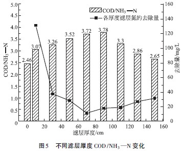 (2) 當(dāng)濾層厚度大于50 cm,COD/NH3-N高于3.52 時(shí),ANAMMOX 脫氮效率開(kāi)始下降,ANAMMOX反應(yīng)將受到較大的抑制作用。HRT 的增加有利于A(yíng)NAMMOX 的充分反應(yīng),增加脫氮效果。