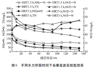 從50 ~110 cm濾層開(kāi)始,COD 去除量又開(kāi)始增加。此時(shí)在高碳源環(huán)境下,反硝化菌的生長(zhǎng)速率遠(yuǎn)大于A(yíng)NAMMOX 菌的生長(zhǎng)速率,反硝化菌過(guò)度繁殖,ANAMMOX 菌在和反硝化菌競(jìng)爭(zhēng)NO2--N 中占劣勢(shì),ANAMMOX 反應(yīng)受到抑制,亞硝酸鹽的消耗降低,反硝化作用開(kāi)始增強(qiáng)。而110~150 cm濾層由于含氧量增加,有機(jī)物對(duì)ANAMMOX 過(guò)程影響進(jìn)一步增強(qiáng),硝化反應(yīng)增強(qiáng),有機(jī)物消耗增加。將HRT 從1.5 h 增加到3 h,出水COD 有明顯的下降趨勢(shì),說(shuō)明在高濃度的COD 進(jìn)水中,增加HRT 對(duì)COD 的去除有一定的促進(jìn)作用。具體參見(jiàn)http://www.bnynw.com更多相關(guān)技術(shù)文檔。