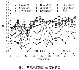 從圖7 沿濾層厚度的pH 變化情況可以看出,隨著ANAMMOX 反應(yīng)的進(jìn)行,水中pH 呈現(xiàn)逐漸升高趨勢(shì),這主要是由于A(yíng)NAMMOX 反應(yīng)H+的逐漸消耗造成的,另外,從圖7 還可以看出,0~ 50 cm 濾層,pH呈現(xiàn)明顯的上升趨勢(shì),為7.6~8.2,而在50~130 cm濾層pH 為8.2~8.4,可見(jiàn)在處理干法腈綸廢水時(shí),ANAMMOX 反應(yīng)主要在0~50 cm濾層進(jìn)行,50 ~130 cm濾層ANAMMOX 反應(yīng)速率開(kāi)始下降。而且在正常運(yùn)行條件下,pH 變化規(guī)律隨濾層增加幾乎呈直線(xiàn)上升,而在90 cm濾層時(shí),pH 則開(kāi)始下降。此時(shí),由于A(yíng)NAMMOX 反應(yīng)受到抑制,但有機(jī)物含量仍較高,有機(jī)物的水解酸化造成了pH 下降。對(duì)比不同HRT 下pH 變化可以發(fā)現(xiàn),隨HRT 的增加,各厚度濾層pH 逐步趨于穩(wěn)定。