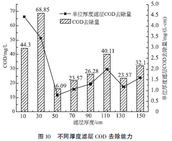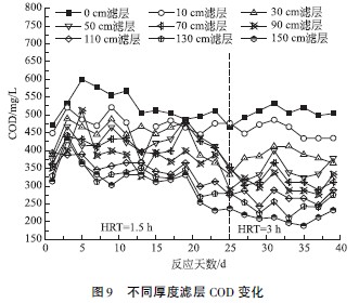 從圖9 不同厚度濾層COD 變化可以看出,隨著ANAMMOX 反應(yīng)的進(jìn)行,沿濾層厚度增大COD 呈逐漸降低趨勢(shì),這主要是由于伴隨ANAMMOX 反應(yīng)的同時(shí)進(jìn)行異養(yǎng)反硝化造成的。