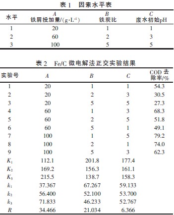 Fe/C 微電解實(shí)驗(yàn)中先進(jìn)行正交實(shí)驗(yàn),以確定一些因素對(duì)廢水COD 去除率的影響大小,再進(jìn)行各影響因素的具體單因素實(shí)驗(yàn),以確定最佳處理?xiàng)l件。