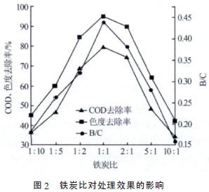 2.2.2鐵炭比對(duì)微電解處理效果的影響
