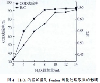 (2)Fenton 氧化處理Fe/C 微電解處理后廢水,在H2O2的投加量為8 mL,無(wú)需投加FeSO4的條件下,廢水的COD 的去除率可以達(dá)到90%,B/C 從0.41 升高到0.64。
