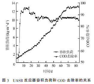UASB 反應(yīng)器容積負(fù)荷和COD 去除率的關(guān)系如圖3 所示。