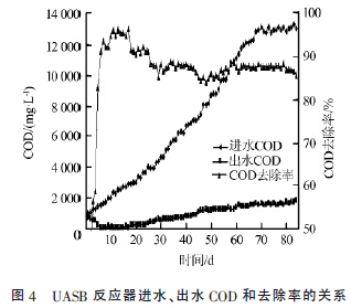 UASB 反應(yīng)器進(jìn)水、出水COD 和COD 去除率的關(guān)系如圖4 所示。