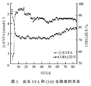 2.1.2 UASB 反應(yīng)器出水VFA 和COD 去除率的關(guān)系