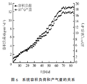 系統(tǒng)容積負(fù)荷和沼氣產(chǎn)量的關(guān)系如圖6 所示。