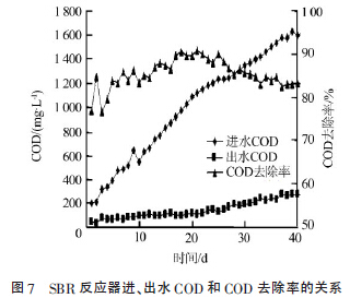 SBR 反應(yīng)器進(jìn)、出水COD 的變化情況以及COD 的去除率如圖7 所示。