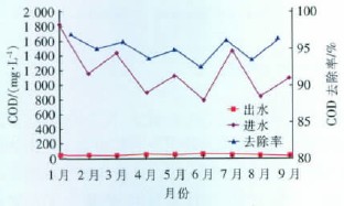 圖2 A/O+BAF工藝對(duì)COD 的去除效果
